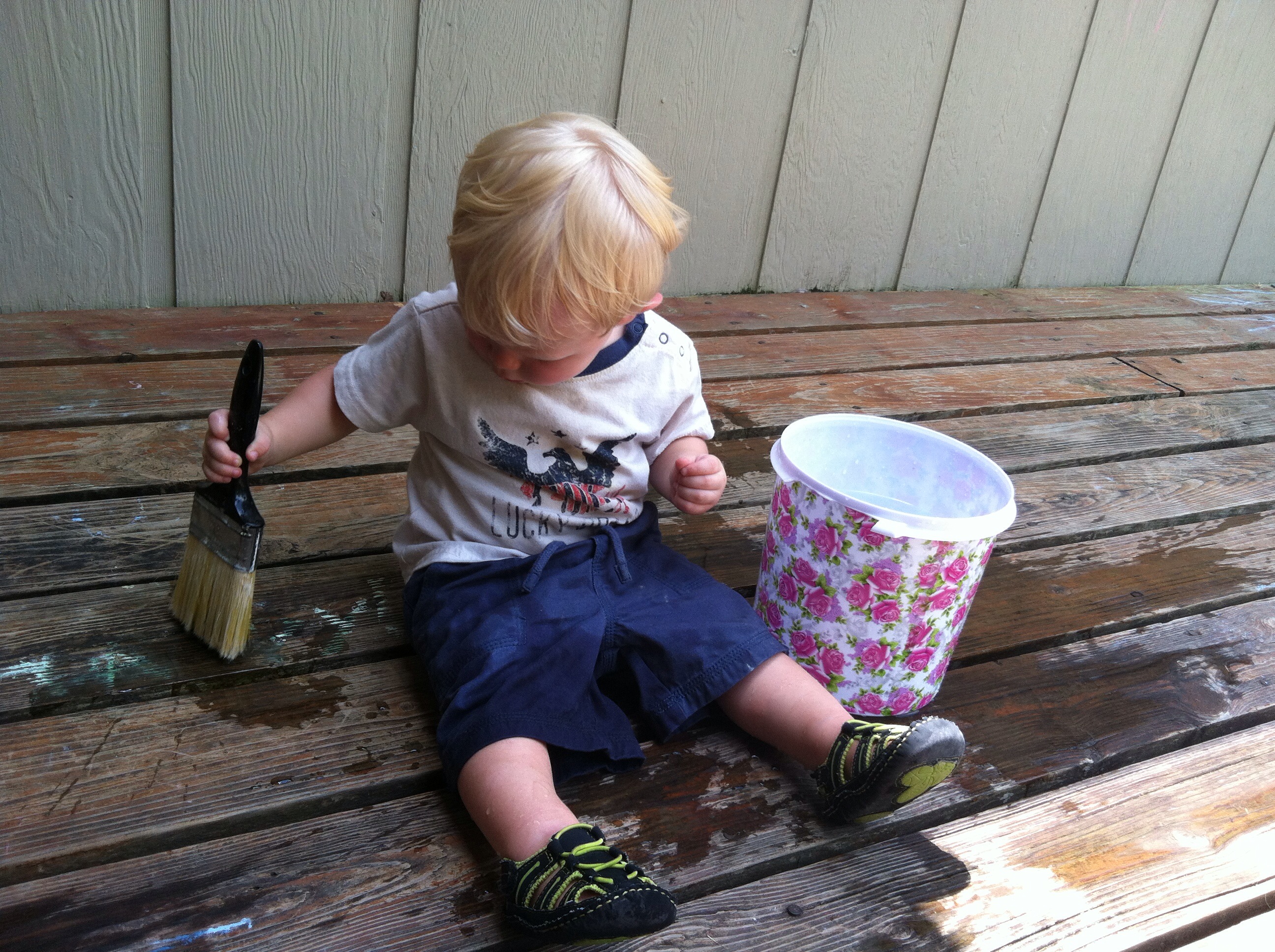 2.) Painting the Sidewalk/Deck: This one is so easy. Give you toddler a paintbrush and a bucket of water. They will have a ball! My sweet pea painted our entire deck and sidewalk. It kept him busy all afternoon.
