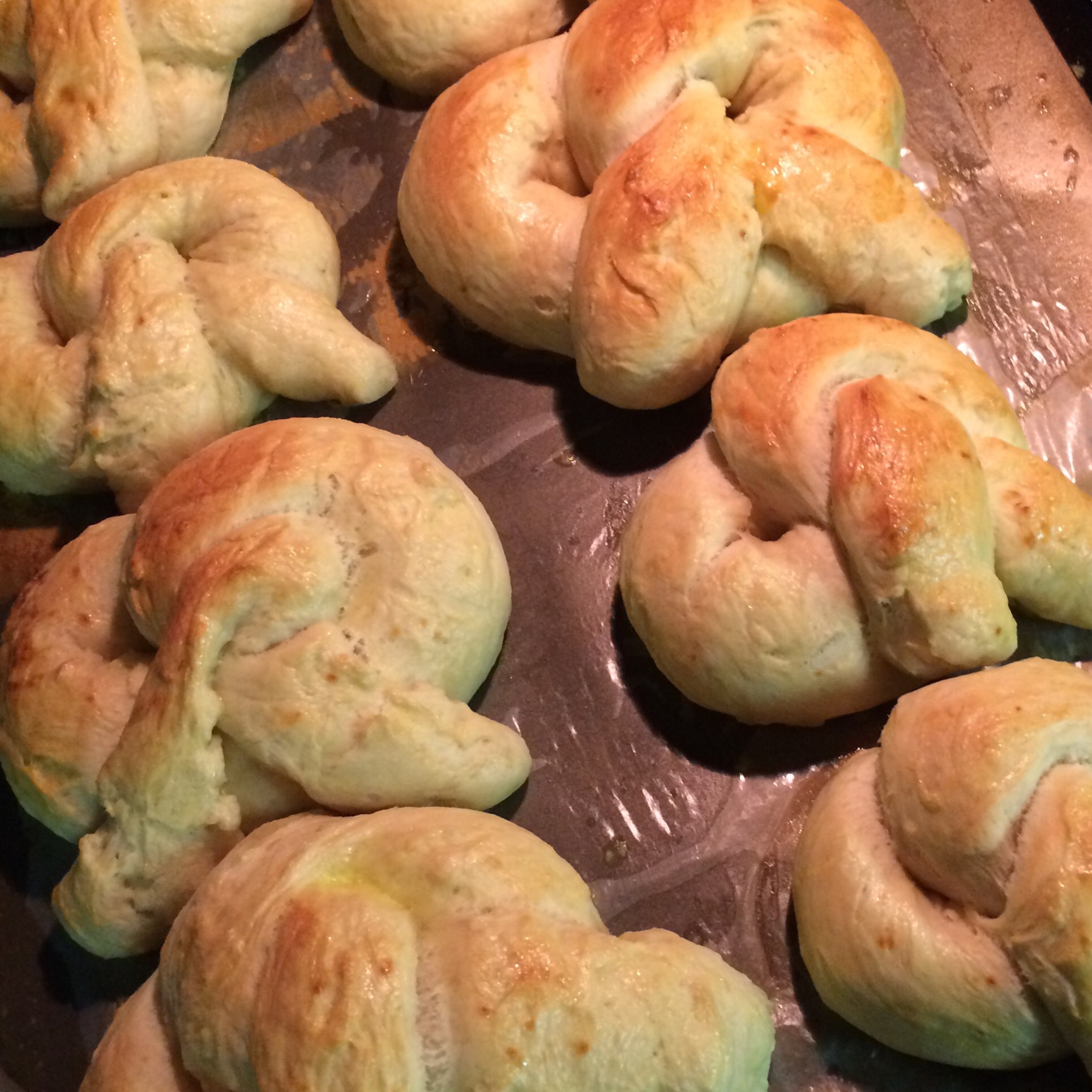 Knead the dough out onto a slightly oiled work surface and divide into 8 equal pieces. Roll out each piece of dough into a 24-inch rope. Make a U-shape with the rope, holding the ends of the rope, cross them over each other and press onto the bottom of the U in order to form the shape of a pretzel. Place onto greased piece of parchment paper.