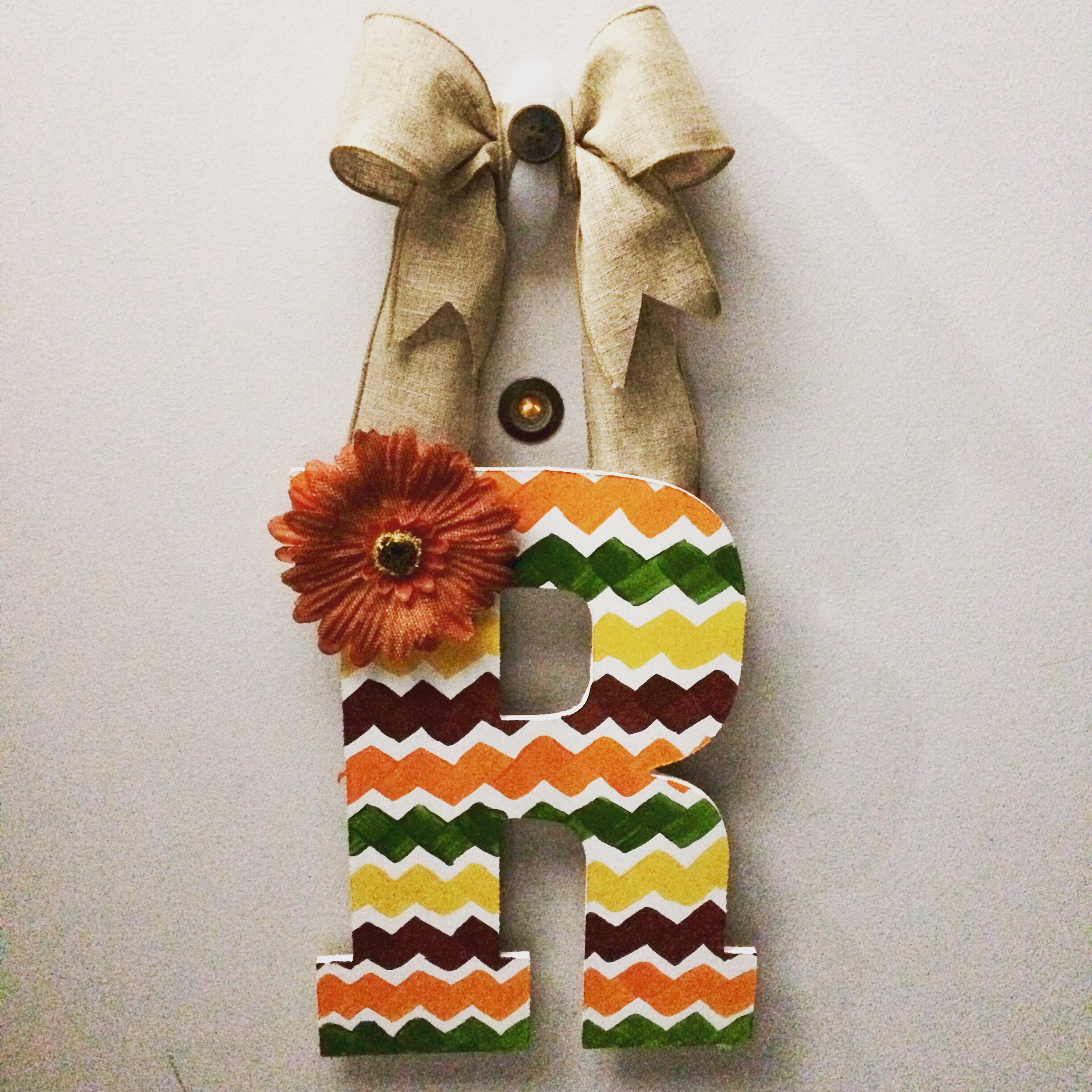 Paint your monogram letter completely white. I did three coats on mine. Then once dried, paint your design on the letter. I chose a Chevron pattern but stripes or polka dots would be super cute too. Once your paint has dried, hot glue fake fall flowers wherever you would like on the letter. Then take your burlap and make a bow for the hanger of your wreath. Hot glue the two ends on the back of your letter. And TADA!!! You have a absolutely adorable fall wreath to bring in the warmth and excitement of the season to any front door.