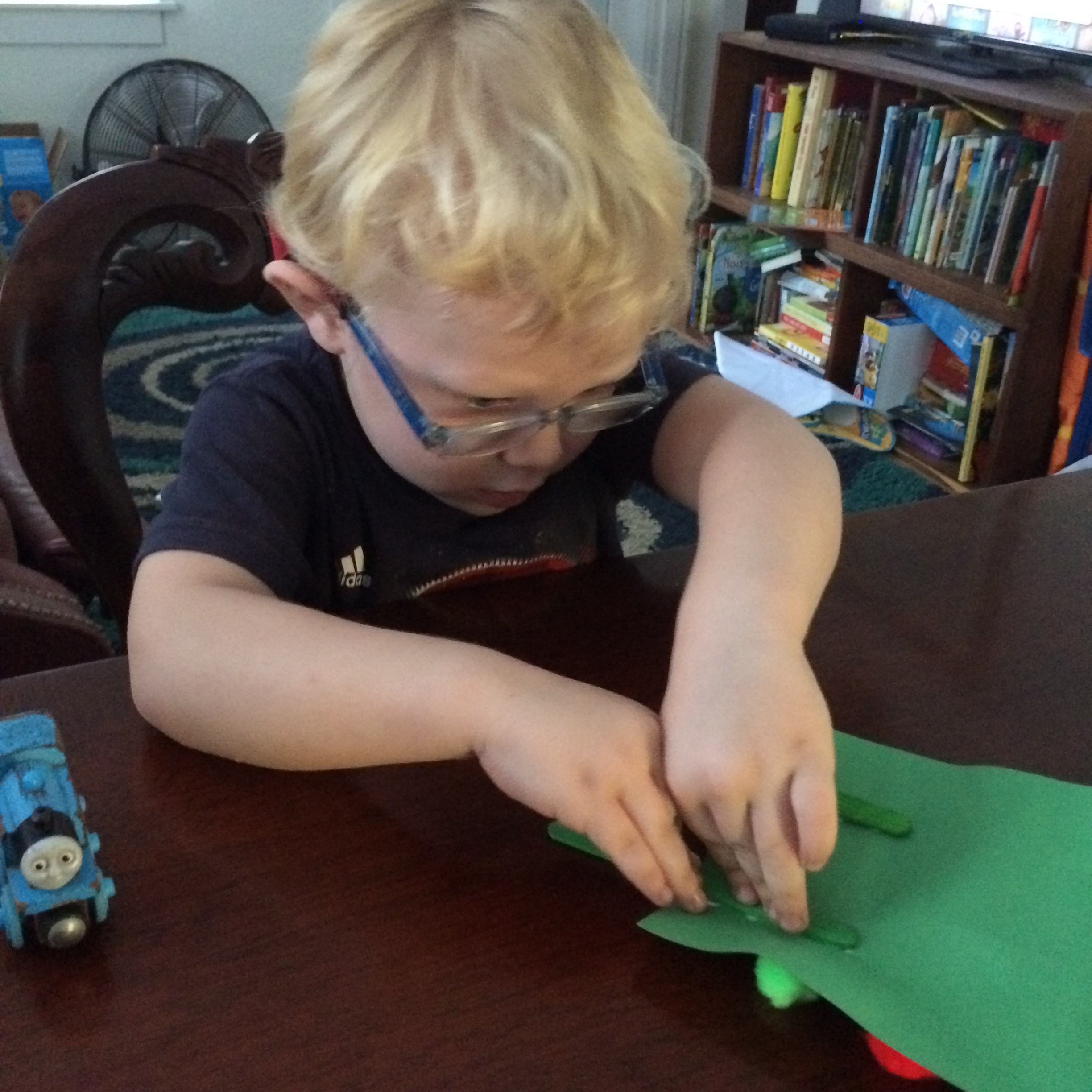 Cut out your Popsicle shape to be decorated. It can be whatever shape you desire. Then, have your little ones color and design the Popsicle. The boys used a variety of crayons, Pom poms, glitter glue, and foam dinosaur stickers to decorate. Let it dry. Then, once dry, glue the wooden craft stick on the back. You can use one or two, depending on your design.