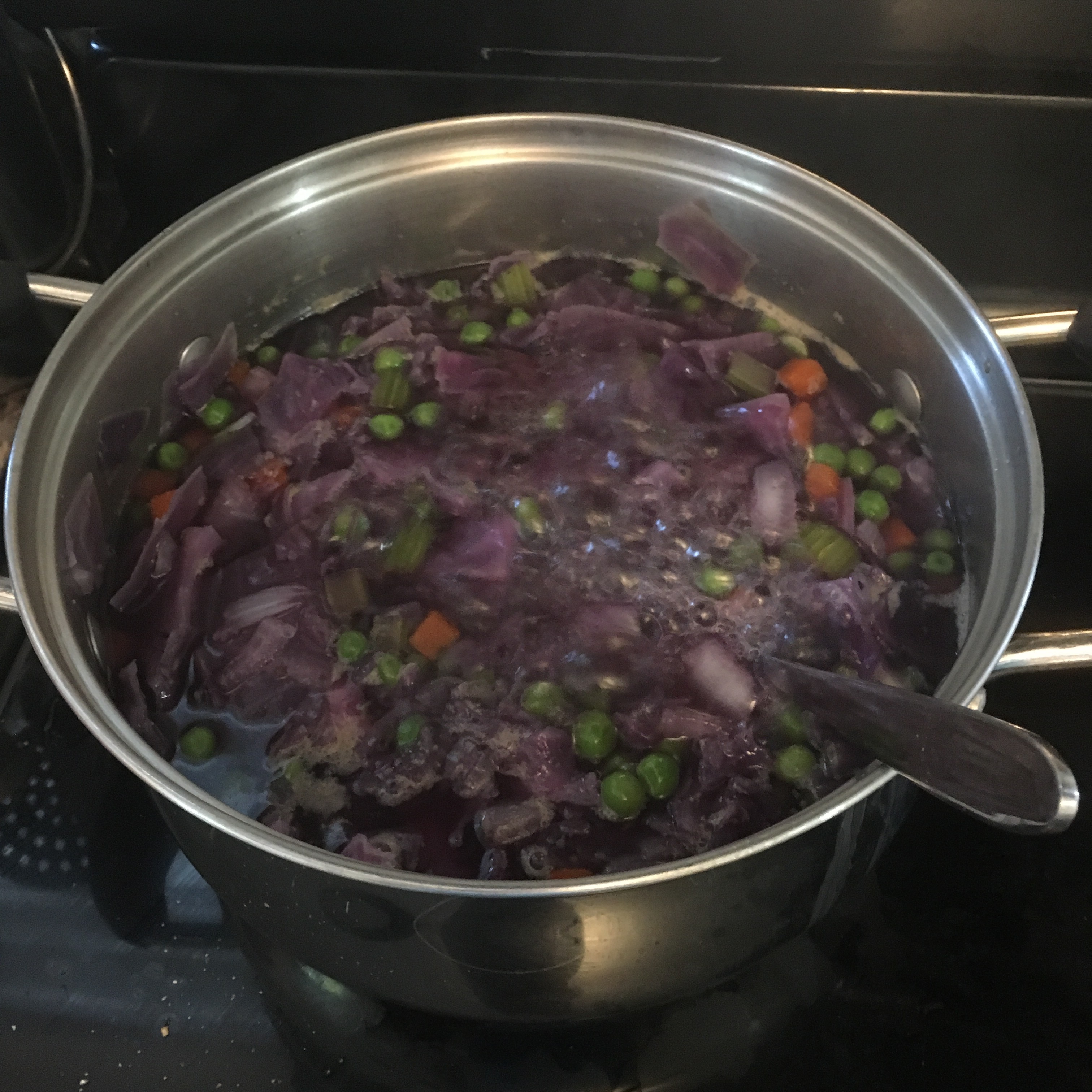 In a large soup pot on medium high heat, add olive oil. Then, sauté onions, celery, and garlic. Once onions are browned, add chicken broth, bay leaves, salt, pepper, parsley, and thyme. Bring to a boil, add purple cabbage. Once cabbage is tender, turn heat to medium. Add crab meat and frozen peas and carrots. Cook for 5-7 mins. In a small bowl, whisk eggs together. Slowly pour the eggs into soup while stirring. Serve with Cloud Bread.