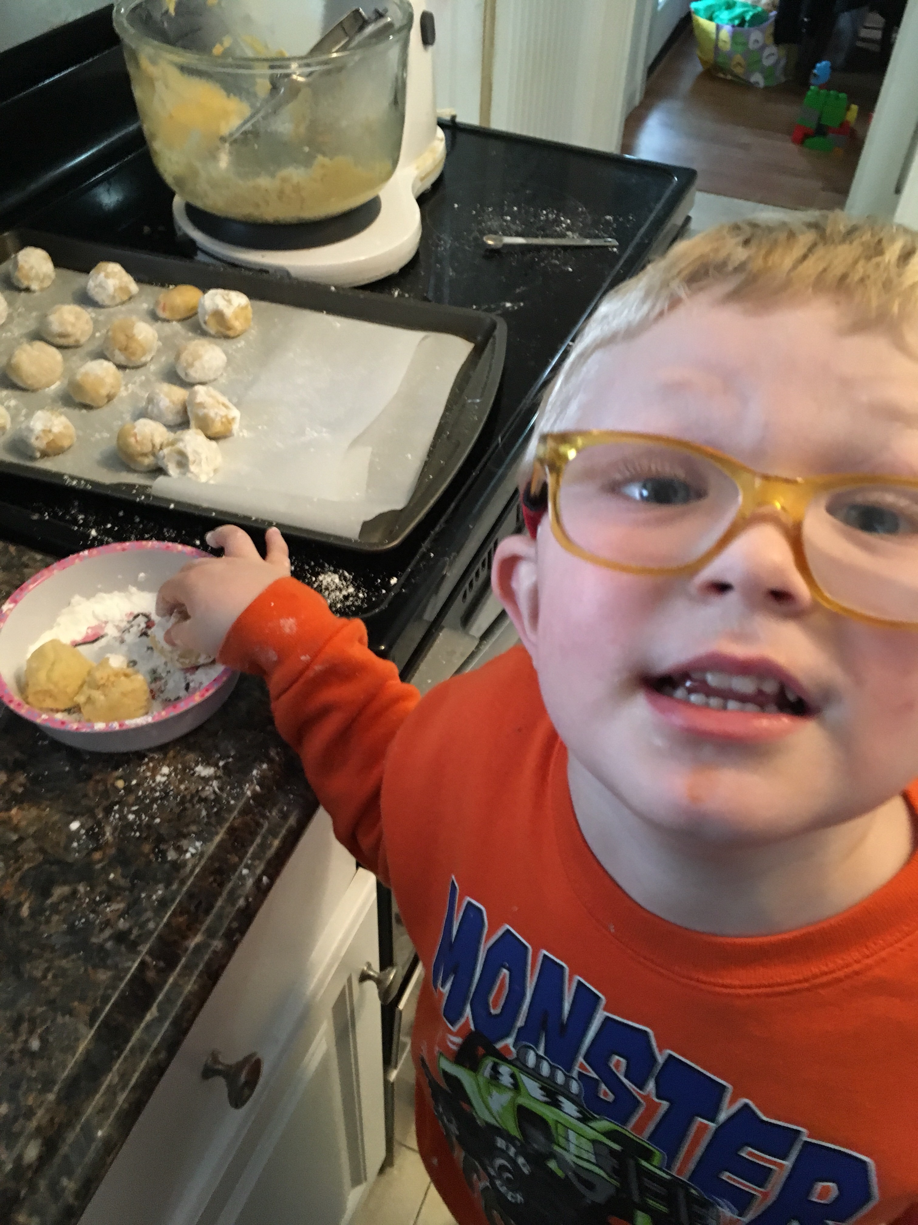Pour powdered sugar in a small bowl. Roll a tablespoon sized amount of dough into a ball and roll it in the powdered sugar, shaking off the excess. Place on prepared baking sheet and repeat with remaining dough.