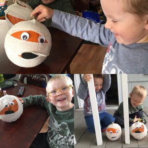My boys love Curious George. One of their favorites is Boo Fest. So we decided to make our own No Noggins to celebrate and then of course we had to watch Boo Fest afterwards with our crafted No Noggins.