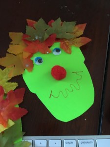 With the center of Leaf Wreaths leftover, I cut out a head for the boys to make Frankenstein Leaf Men.