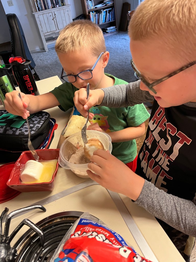 While scrolling through Facebook one evening, I came across a photo. In the photo, it showed a recipe for Hocus Pocus Buns. I had to try it. Now granted not everything on Facebook is true or turns out as easy as a photo shows. It was simple recipe though. All you need are a tube of crescent rolls, large marshmellows, cinnamon sugar, and butter.